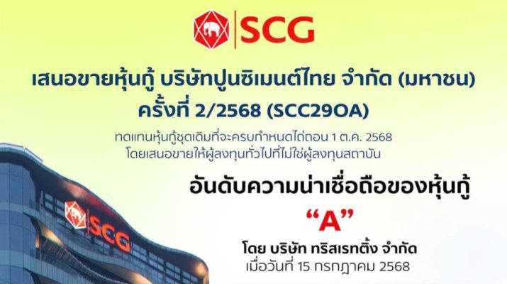 ทั้งนี้ บริษัทปูนซิเมนต์ไทย จำกัด (มหาชน) หรือเอสซีจี ได้รับอนุมัติการยื่นแบบแสดงรายการข้อมูลการเสนอขายตราสารหนี้และร่างหนังสือชี้ชวน จากสำนักงานคณะกรรมการกำกับหลักทรัพย์และตลาดหลักทรัพย์ เพื่อเสนอขายหุ้นกู้ชุดใหม่ ชนิดระบุชื่อผู้ถือ ไม่ด้อยสิทธิ ไม่มีประกัน และมีผู้แทนผู้ถือหุ้นกู้ มูลค่าเสนอขาย 25,000 ล้านบาท อายุหุ้นกู้ 4 ปี โดยหุ้นกู้ดังกล่าวได้รับการจัดอันดับความน่าเชื่อถืออยู่ที่ A จาก บริษัท ทริสเรทติ้ง จำกัด เมื่อวันที่ 15 กรกฎาคม 2568 สะท้อนสถานะทางการเงินของเอสซีจีที่แข็งแกร่ง ตลอดจนการบริหารจัดการความหลากหลายของธุรกิจและฐานลูกค้าที่มีประสิทธิภาพ