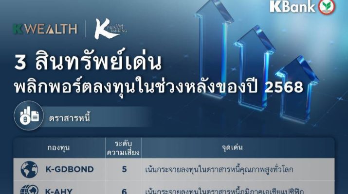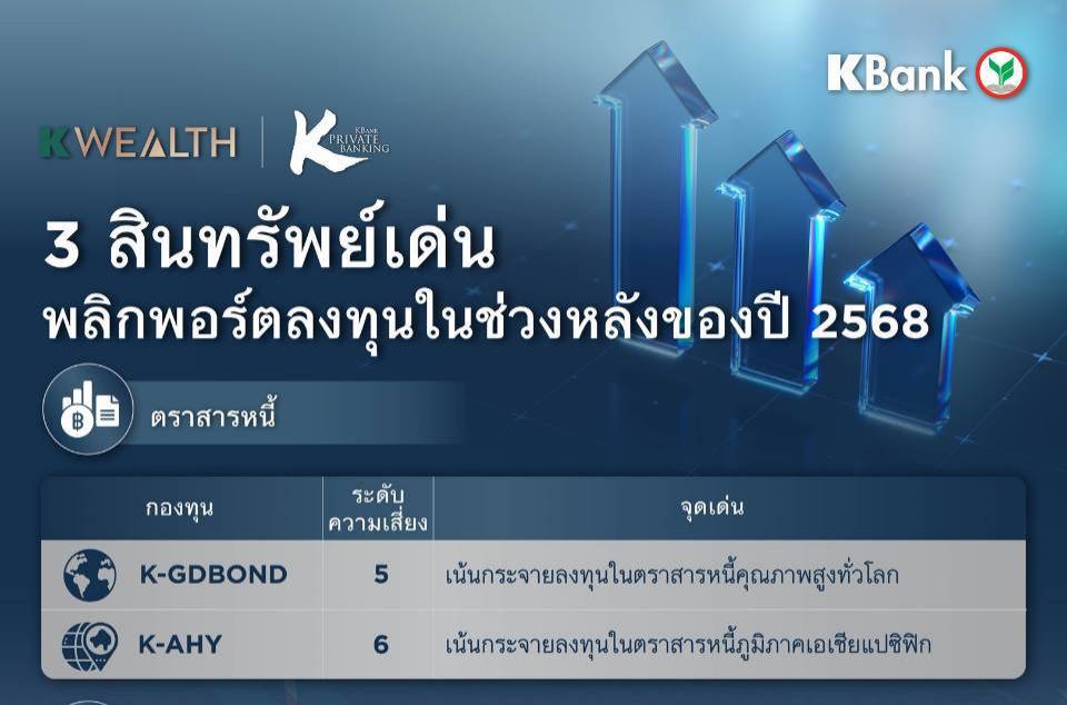KBank Private Banking แนะนักลงทุนจับตา 3 สินทรัพย์เด่นที่จะนำพอร์ตลงทุนฝ่าวิกฤต และสร้างผลตอบแทนในช่วงหลังของปี 2568 ที่ตลาดลงทุนยังต้องเผชิญกับความผันผวนอย่างต่อเนื่อง เพราะกำลังเข้าสู่จุดเปลี่ยนสำคัญเชิงนโยบาย สะท้อนผ่านการปรับท่าทีของธนาคารกลางหลัก ๆ โดยเฉพาะสหรัฐฯ ที่มีแนวโน้มจะลดดอกเบี้ยลงได้ อีกทั้งยังมีการส่งสัญญาณผ่อนคลายเพิ่มเติมในปีหน้า ท่ามกลางเศรษฐกิจที่ชะลอตัว และความตึงเครียดด้านการค้ากับจีนและพันธมิตรอื่น ๆ ได้แก่