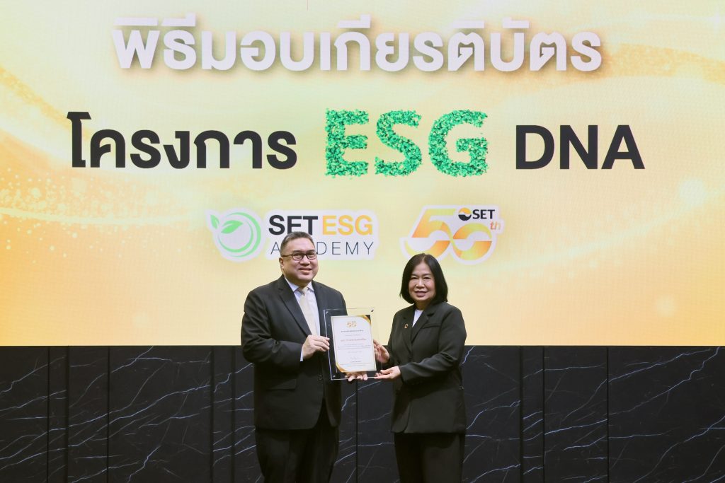 รับมอบเกียรติบัตร : คุณอัจฉรา เจริญพร (ขวา) ผู้ช่วยกรรมการผู้จัดการอาวุโส สายงานพัฒนาความยั่งยืนองค์กร บมจ.ทางยกระดับดอนเมือง หรือ DMT รับมอบเกียรติบัตรโครงการ “ESG DNA ชุดความรู้ด้านความยั่งยืนสำหรับบุคลากรทุกระดับในองค์กร” จัดโดยตลาดหลักทรัพย์แห่งประเทศไทย เพื่อแสดงว่า DMT ให้ความสำคัญและส่งเสริมพนักงานขององค์กรเข้าใจหลักการพัฒนาองค์กรตามกรอบ ESG และปลูกฝัง DNA ด้านความยั่งยืน เพื่อให้สามารถประยุกต์ใช้และต่อยอดการพัฒนาองค์กรให้เติบโตอย่างมั่นคง ทั้งนี้ โครงการ ESG DNA เป็นรางวัลสำหรับองค์กรที่มีพนักงานผ่านหลักสูตรพื้นฐานด้านความยั่งยืนเกินกว่า 70% โดยได้รับเกียรติจาก ดร.ศรพล ตุลยะเสถียร (ซ้าย) รองผู้จัดการ ตลาดหลักทรัพย์แห่งประเทศไทย เป็นผู้มอบ ณ หอประชุมศุกรีย์ แก้วเจริญ ตลาดหลักทรัพย์แห่งประเทศไทย เมื่อเร็วๆนี้