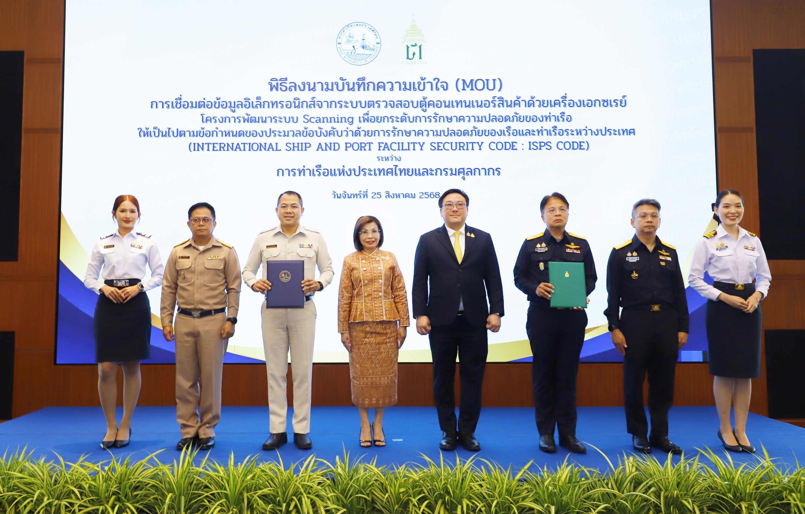 ลงนาม MOU : นางมนพร เจริญศรี รัฐมนตรีช่วยว่าการกระทรวงคมนาคม และนายจุลพันธ์ อมรวิวัฒน์ รัฐมนตรีช่วยว่าการกระทรวงการคลัง ร่วมเป็นประธานสักขีพยานในพิธีลงนาม MOU ว่าด้วยการเชื่อมต่อข้อมูลอิเล็กทรอนิกส์จากระบบตรวจสอบตู้คอนเทนเนอร์สินค้าด้วยเครื่องเอกซเรย์ (Scanning System) โครงการพัฒนาระบบ Scanning เพื่อยกระดับการรักษาความปลอดภัยของท่าเรือให้เป็นไปตามข้อกำหนดของประมวลข้อบังคับว่าด้วยการรักษาความปลอดภัยของเรือและท่าเรือระหว่างประเทศ (International Ship and Port Facility Security Code : ISPS Code) ระหว่าง กทท. และกรมศุลกากร โดยมี นายเกรียงไกร ไชยศิริวงศ์สุข ผู้อำนวยการ กทท. และ นายธีรัชย์ อัตนวานิช อธิบดีกรมศุลกากร เป็นผู้ลงนาม ณ ห้องประชุมชั้น 19 อาคารที่ทำการ กทท.เมื่อเร็วๆนี้