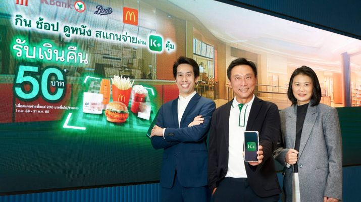 ดร.เกษชญง สกาวรัตนานนท์ รองผู้จัดการใหญ่ (กลาง) ธนาคารกสิกรไทย นายนรุตม์ เจียรสนอง (ซ้าย) รองประธานเจ้าหน้าที่บริหารฝ่ายการตลาด บมจ. เมเจอร์ ซีนีเพล็กซ์ กรุ้ป และนางสาวพรรณี ศานติวิวัฒน์กุล (ขวา) ผู้อำนวยการฝ่ายการตลาด บริษัท บู๊ทส์ รีเทล (ประเทศไทย) จำกัด ร่วมด้วย บริษัท แมคไทย จำกัด เปิดตัวโปรโมชันพิเศษให้ลูกค้า K PLUS ที่ซื้อสินค้าหรือใช้บริการที่ 3 ร้านค้าแบรนด์ดัง เพียงชมภาพยนตร์ทุกเรื่องทุกรอบที่ Major Cineplex ช้อปสินค้าสุขภาพและความงามที่ Boots หรืออิ่มอร่อยทุกเมนูที่ McDonald’s ทุกสาขาทั่วประเทศ แล้วสแกนจ่ายด้วย K PLUS ผ่านเครื่องรับชำระเงินธนาคารกสิกรไทย ตั้งแต่ 200 บาทขึ้นไปต่อรายการ รับเงินคืนคุ้ม 50 บาท (จำกัด 1 ท่านต่อ 1 สิทธิ์ต่อแบรนด์ต่อเดือน จำกัด 4,500 สิทธิ์ต่อแบรนด์ตลอดแคมเปญ รวมจำกัด 13,500 สิทธิ์ ตลอดระยะรายการส่งเสริมการขาย) ตั้งแต่ 1 กันยายน 2568 – 31 ตุลาคม 2568