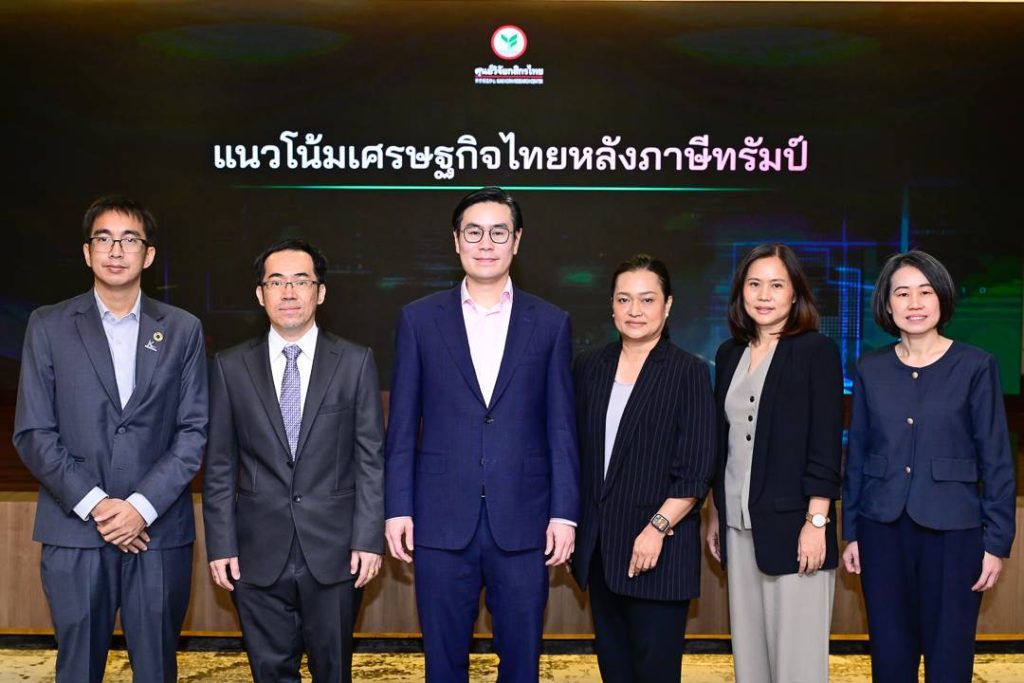 นายบุรินทร์ อดุลวัฒนะ (ที่ 3 จากซ้าย) กรรมการผู้จัดการ และ Chief Economist พร้อมด้วยผู้บริหาร บริษัท ศูนย์วิจัยกสิกรไทย จำกัด แถลงปรับเพิ่มประมาณการจีดีพีปี 2568 มาที่ 1.8% จากแรงหนุนการเร่งส่งออกไปยังสหรัฐฯ โดยเฉพาะสินค้าอิเล็กทรอนิกส์ อีกทั้งมีการชะลอตัวลงน้อยกว่าที่คาดในช่วงครึ่งปีหลัง 2568 ส่งผลให้ความเสี่ยงที่เศรษฐกิจไทยจะเข้าสู่ภาวะถดถอยทางเทคนิคลดต่ำลง ขณะที่ทิศทางอัตราดอกเบี้ยนโยบายในระยะที่เหลือของปี 2568 มองว่า กนง.มีโอกาสปรับลดอัตราดอกเบี้ยนโยบายลงอีก 1 ครั้ง ซึ่งต้องมาควบคู่กับนโยบายกระตุ้นเศรษฐกิจเฉพาะหน้าของรัฐบาลใหม่ ณ ธนาคารกสิกรไทย สำนักงานใหญ่ อาคารพหลโยธิน เมื่อเร็ว ๆ นี้
