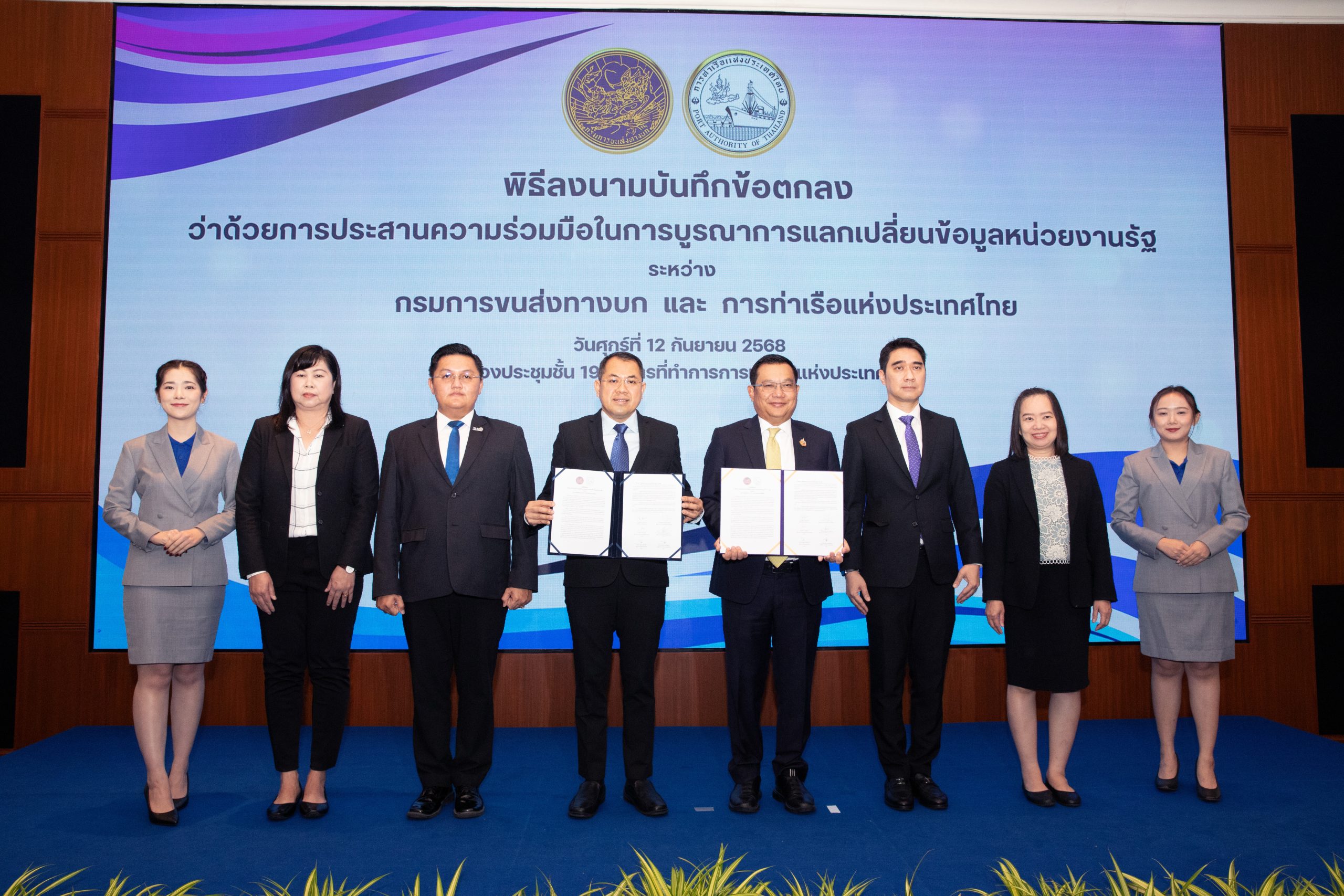 ลงMOU : การท่าเรือแห่งประเทศไทย (กทท.) และ กรมการขนส่งทางบก (ขบ.) ลงนามบันทึกข้อตกลงความร่วมมือ (MOU) ฉบับใหม่ เพื่อทดแทนบันทึกข้อตกลงเดิมที่สิ้นสุดวันที่ 22 สิงหาคม 2568 โดยครั้งนี้ได้ขยายขอบเขตความร่วมมือให้ครอบคลุมถึง ข้อมูลการติดตามรถบรรทุก สำหรับการควบคุมความปลอดภัย และวิเคราะห์ระบบขนส่งสินค้า ถือเป็นก้าวสำคัญในการแลกเปลี่ยนข้อมูลร่วมกัน เพื่อสนับสนุนการดำเนินภารกิจของทั้งสองหน่วยงาน ยกระดับประสิทธิภาพการบริหารงาน การอำนวยความสะดวกในการบริการลูกค้าและประชาชน โดยมีนายเกรียงไกร ไชยศิริวงศ์สุข ผู้อำนวยการ กทท. และ นายจิรุตม์ วิศาลจิตร อธิบดีกรมการขนส่งทางบก เป็นผู้ลงนาม ณ ห้องประชุมชั้น 19 อาคาร กทท.