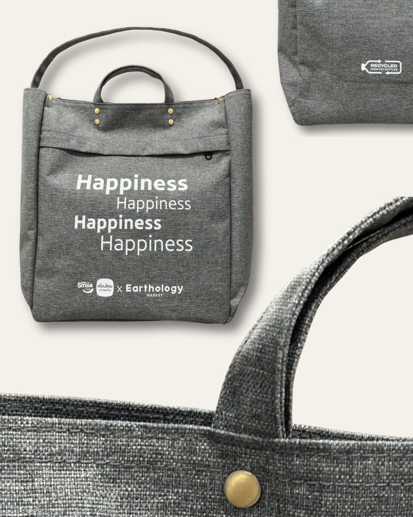 กระเป๋า TOTE BAG 1 ใบ ใช้คะแนนสะสม 150 Smile Points ผลิตจากขวดน้ำพลาสติก PET ถึง 22 ขวด ดีไซน์เท่ จุของได้เยอะ ใช้งานแบบถือหรือสะพายได้ 2 in 1