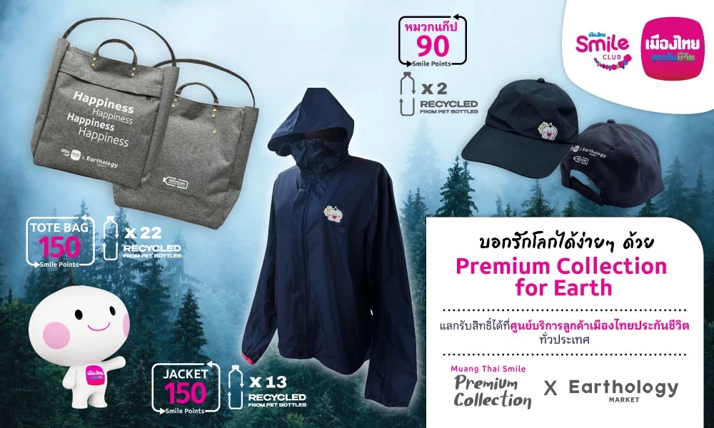 บริษัท เมืองไทยประกันชีวิต จำกัด (มหาชน) โดยเมืองไทยสไมล์คลับ จับมือกับ EARTHOLOGY แบรนด์สินค้าไลฟ์สไตล์รักษ์โลกแบรนด์ไทยแบรนด์เดียว ที่ได้รับการรับรองจาก Blue Sign ในการรับรองมาตรฐานระดับโลกด้านสิ่งแวดล้อมจากสวิตเซอร์แลนด์ ชวนสมาชิกเมืองไทยสไมล์คลับ ร่วมบอกรักโลกได้ง่าย ๆ แบบมีสไตล์ ไปกับคอลเลกชันของพรีเมียมใหม่ล่าสุด ภายใต้แนวคิด Circular Design วัสดุเป็นมิตรกับสิ่งแวดล้อม ที่ทุกขั้นตอนการผลิตคัดสรรและใส่ใจในการรักษาความสมดุลของธรรมชาติ