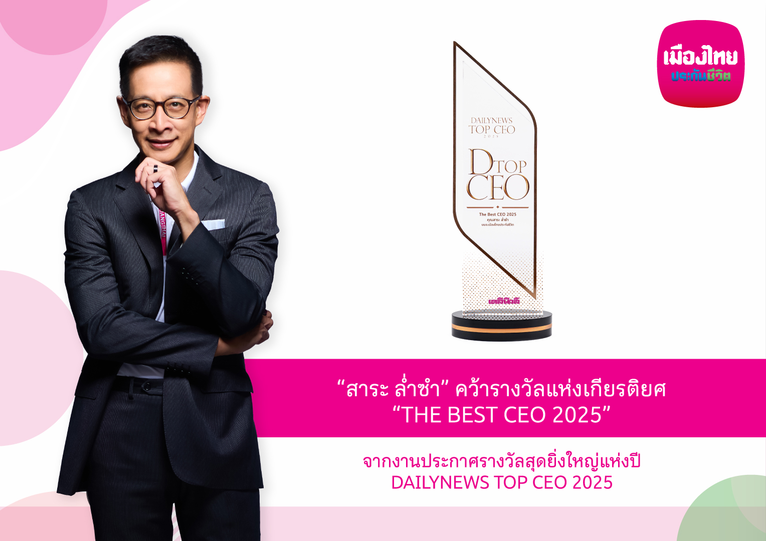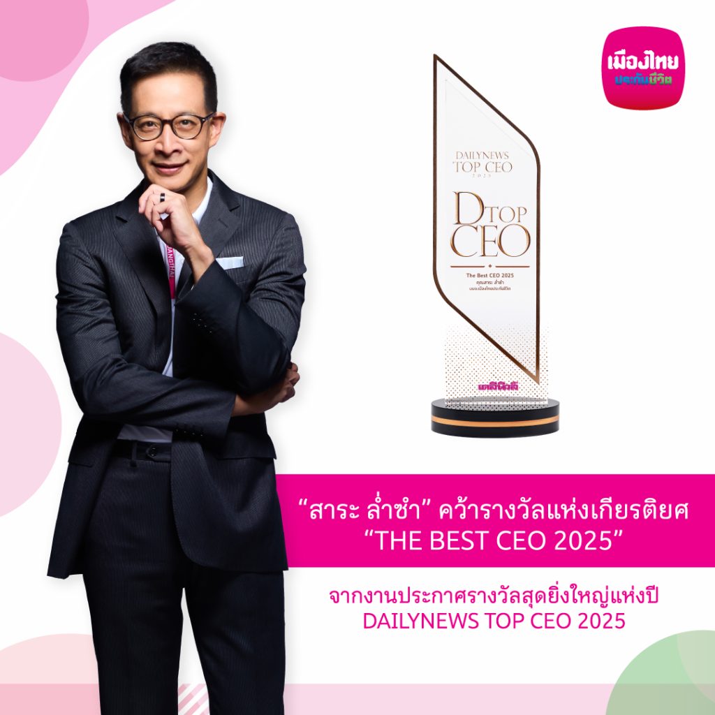 นายสาระ ล่ำซำ ประธานเจ้าหน้าที่บริหาร บริษัท เมืองไทยประกันชีวิต จำกัด (มหาชน) คว้ารางวัลอันทรงเกียรติ “THE BEST CEO 2025” ต่อเนื่องเป็นปีที่ 2 จากเวที DAILYNEWS TOP CEO 2025 การประกาศรางวัลครั้งสำคัญซึ่งจัดโดยหนังสือพิมพ์ เดลินิวส์ เพื่อเชิดชูผู้บริหารสูงสุดที่สร้างผลงานโดดเด่น เป็นที่ประจักษ์ในด้านการขับเคลื่อนองค์กรให้เติบโตอย่างมั่นคงและยั่งยืน ท่ามกลางบริบทเศรษฐกิจและสังคมที่เต็มไปด้วยความท้าทาย อีกทั้งยังเป็นแรงบันดาลใจแก่ผู้ประกอบการรุ่นใหม่และสังคมไทย โดยพิธีจัดขึ้น ณ โรงแรมเซ็นทารา แกรนด์ แอท เซ็นทรัลเวิลด์