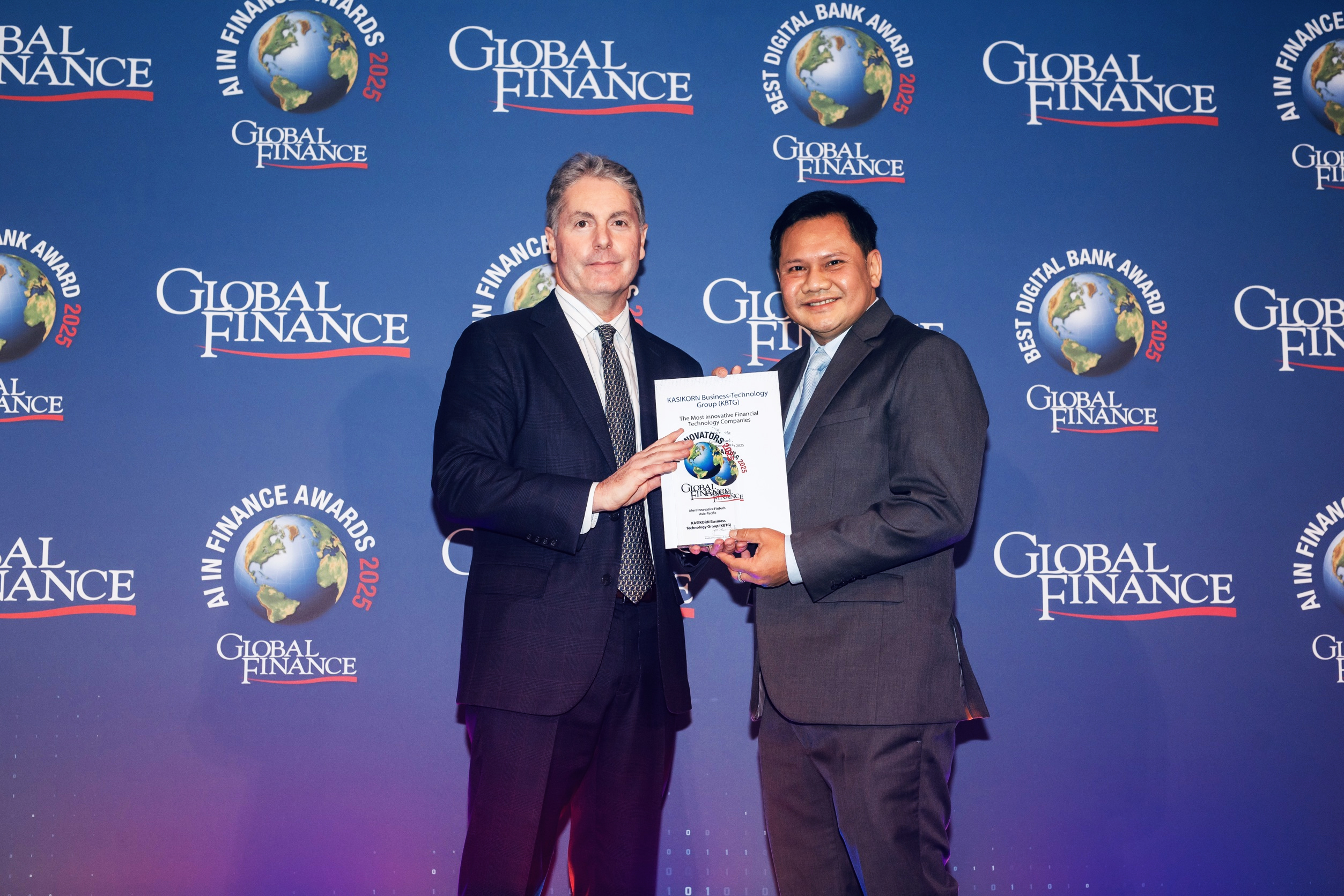 นายเรืองโรจน์ พูนผล (ขวา) ประธานกลุ่มบริษัท กสิกร บิซิเนส-เทคโนโลยี กรุ๊ป (KBTG) เป็นผู้แทน KBTG รับรางวัล The Innovators 2025 ในสาขาบริษัทเทคโนโลยีทางการเงินที่มีนวัตกรรมโดดเด่นที่สุดในภูมิภาคเอเชียแปซิฟิก ประจำปี 2025 (Most Innovative Financial Technology Company in Asia-Pacific 2025) โดยเป็นครั้งแรกที่องค์กรไทยได้รับรางวัลในสาขานี้ จากความสำเร็จในการพัฒนาโซลูชันเทคโนโลยีที่พลิกโฉมการให้บริการของธนาคารกสิกรไทย และยกระดับประสบการณ์ของผู้ใช้บริการทางการเงินทั่วประเทศ โดยมี Mr.Chris Giarraputo (ซ้าย), Managing Director, Operations เป็นผู้มอบ จากงาน World’s Best Digital Bank & AI Awards Ceremony จัดโดยนิตยสาร Global Finance นิตยสารสื่อการเงินชั้นนำของโลก ณ กรุงลอนดอน ประเทศอังกฤษ เมื่อเร็วๆ นี้