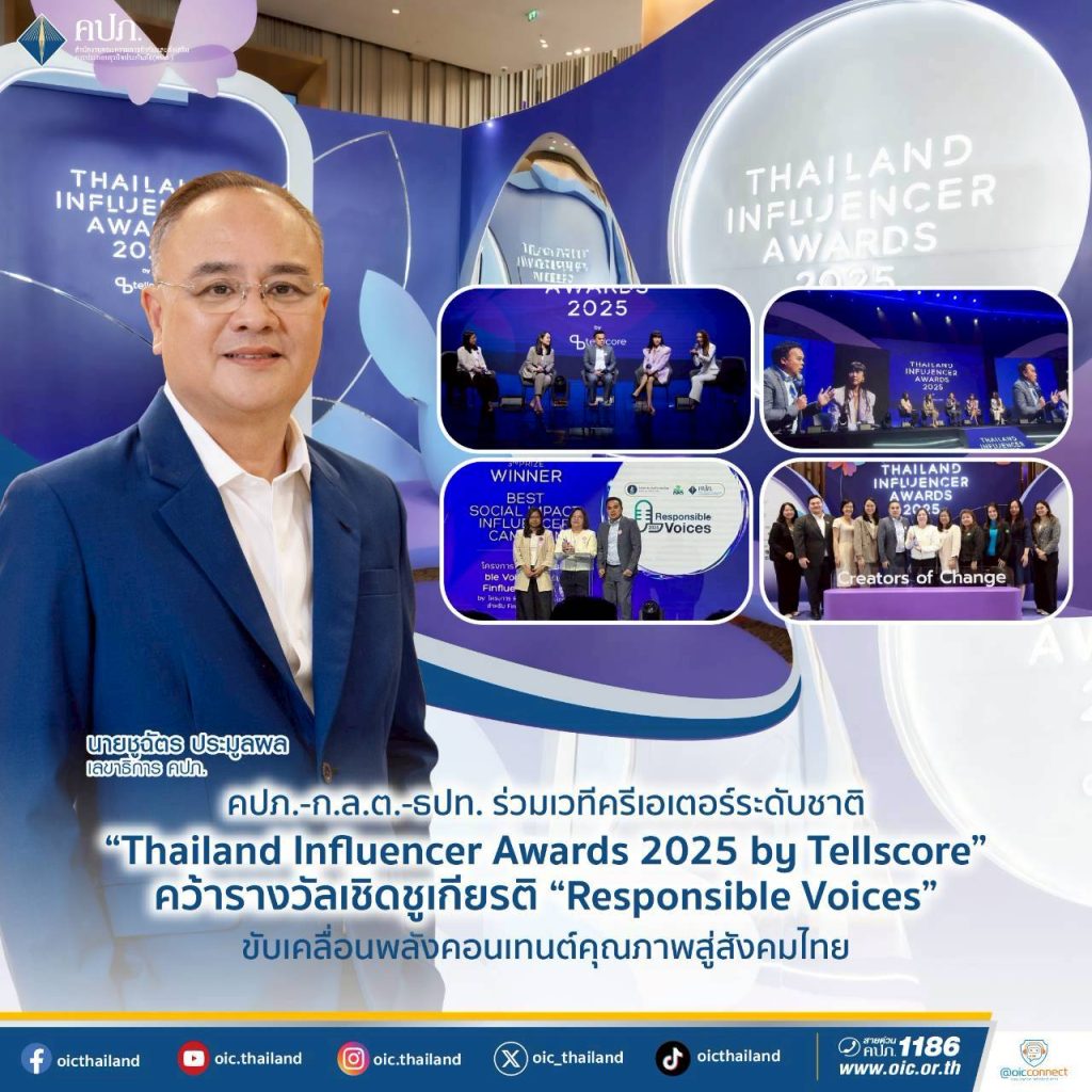 สำนักงานคณะกรรมการกำกับและส่งเสริมการประกอบธุรกิจประกันภัย (สำนักงาน คปภ.)โดย นายชูฉัตร ประมูลผล เลขาธิการ คปภ. มอบหมายให้นายเจษฎา วรรณเขจร ผู้อำนวยการกลุ่มงานสื่อสารองค์กร เป็นผู้แทนสำนักงาน คปภ. เข้าร่วมงาน “Thailand Influencer Awards 2025 by Tellscore” ซึ่งจัดโดย บริษัท เทลสกอร์ จำกัด ผู้นำด้านแพลตฟอร์ม Influencer Marketing Automation ณ TRUE ICON HALL ชั้น 7 ศูนย์การค้าไอคอนสยาม ภายใต้ธีม “Creators of Change – ครีเอเตอร์เปลี่ยนโลกพารอด”