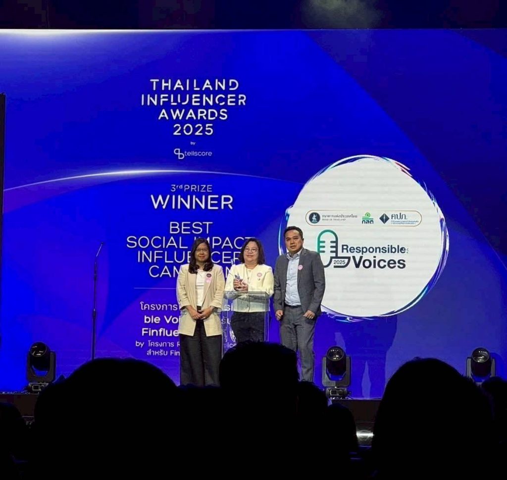 ในโอกาสนี้ ผู้แทนจากทั้ง 3 หน่วยงาน ได้ขึ้นเวทีรับรางวัลเชิดชูเกียรติจากโครงการ Responsible Voices ซึ่งเป็นการยกย่องบทบาทขององค์กรที่ให้การสนับสนุนและร่วมขับเคลื่อนแนวคิด “Responsible Voices” อย่างต่อเนื่อง เพื่อส่งเสริมการสื่อสารทางการเงินและการประกันภัยอย่างมีความรับผิดชอบ โปร่งใส และเป็นประโยชน์ต่อสังคม รางวัลดังกล่าวสะท้อนถึงความมุ่งมั่นของทั้ง 3 หน่วยงานกำกับภาคการเงิน ในการร่วมกันสร้างระบบนิเวศการสื่อสารทางการเงินที่มีจริยธรรม และเป็นพลังในการยกระดับมาตรฐานคอนเทนต์เชิงคุณภาพของประเทศอย่างยั่งยืน ทั้งนี้ สำนักงาน คปภ. ในฐานะหน่วยงานกำกับดูแลธุรกิจประกันภัย จะยังคงเดินหน้าส่งเสริมการสื่อสารที่มีความรับผิดชอบ สนับสนุนคอนเทนต์เชิงสร้างสรรค์ และร่วมสร้างสังคมแห่งความรู้ทางการเงินและประกันภัยที่ยั่งยืน เพื่อให้ประชาชนได้รับความคุ้มครองอย่างมั่นใจในทุกมิติ