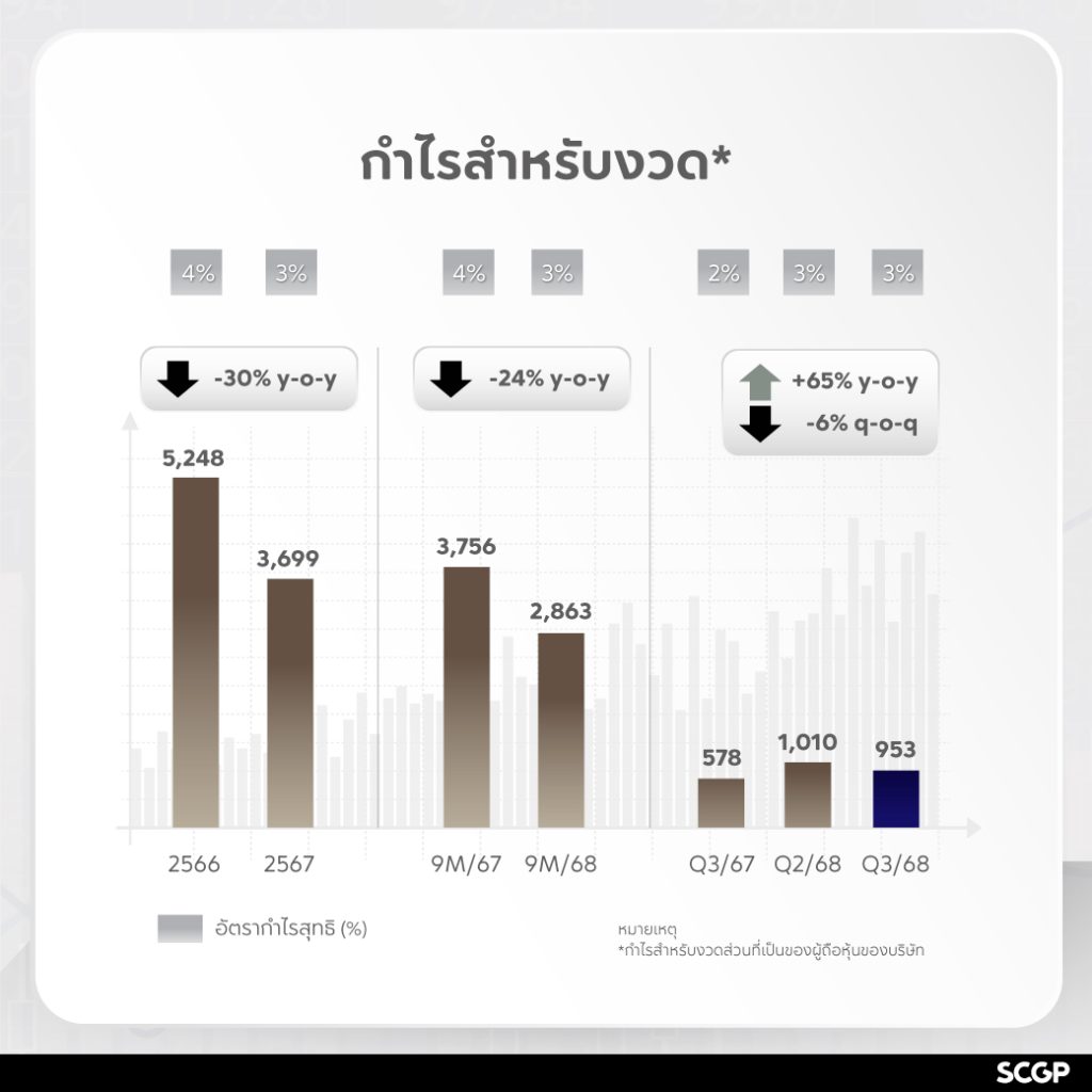 สำหรับการปรับกลยุทธ์เชิงรุกท่ามกลางความท้าทาย ทำให้ในไตรมาสที่ 3 ของปี 2568 SCGP มีรายได้จากการขายรวม 30,438 ล้านบาท ลดลงร้อยละ 9 เมื่อเทียบกับปีก่อน และลดลงร้อยละ 4 จากไตรมาสก่อน ขณะที่ EBITDA อยู่ที่ 4,154 ล้านบาท เพิ่มขึ้นร้อยละ 19 เมื่อเทียบกับปีก่อน ลดลงร้อยละ 2 จากไตรมาสก่อน และมีกำไรสำหรับงวด 953 ล้านบาท เพิ่มขึ้นร้อยละ 65 เมื่อเทียบกับปีก่อนจากผลการดำเนินงานของธุรกิจบรรจุภัณฑ์กระดาษในอินโดนีเซียที่ดีขึ้น ขณะที่ลดลงร้อยละ 6 จากไตรมาสก่อนสอดคล้องกับรายได้ ส่วน EBITDA margin ปรับตัวดีขึ้นจากการบริหารจัดการต้นทุนพลังงานและสาธารณูปโภคในกระบวนการผลิตอย่างมีประสิทธิภาพ
