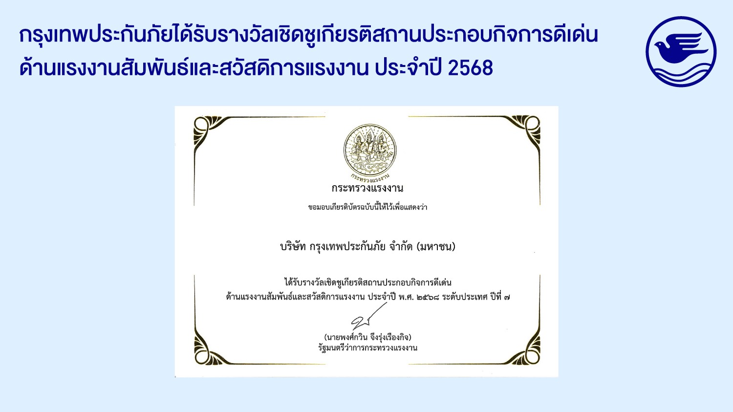 บริษัท กรุงเทพประกันภัย จำกัด (มหาชน) ได้รับรางวัลเชิดชูเกียรติสถานประกอบกิจการดีเด่น ด้านแรงงานสัมพันธ์และสวัสดิการแรงงาน ระดับประเทศ ประจำปี 2568 จากกรมสวัสดิการและคุ้มครองแรงงาน กระทรวงแรงงาน ต่อเนื่องเป็นปีที่ 7 ประเภทไม่มีสหภาพแรงงาน กลุ่มสถานประกอบกิจการขนาดใหญ่ รางวัลดังกล่าวสะท้อนให้เห็นถึงความมุ่งมั่นของบริษัทฯ ในการดูแลพนักงานอย่างเป็นธรรม สร้างความสัมพันธ์อันดีระหว่างนายจ้างและลูกจ้าง ตลอดจนส่งเสริมคุณภาพชีวิตที่ดีของบุคลากร ผ่านนโยบายด้านสวัสดิการ การพัฒนาศักยภาพ และการสร้างสภาพแวดล้อมการทำงานที่ปลอดภัยและมีความสุข นับเป็นอีกหนึ่งความภาคภูมิใจที่สะท้อนถึงการดำเนินงานตามหลักธรรมาภิบาลและความรับผิดชอบต่อสังคมขององค์กรอย่างต่อเนื่อง