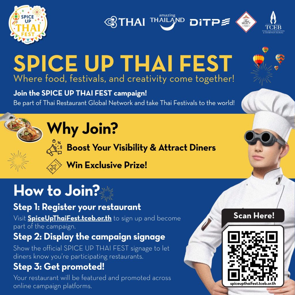 สำนักงานส่งเสริมการจัดประชุมและนิทรรศการ (องค์การมหาชน) หรือ ทีเส็บ ผนึกกำลังพันธมิตรหลัก ได้แก่ การท่องเที่ยวแห่งประเทศไทย (ททท.) กรมส่งเสริมการค้าระหว่างประเทศ (DITP) และบริษัท การบินไทย จำกัด (มหาชน) เปิดตัวแคมเปญ “SPICE UP THAI FEST” เพื่อดึงดูดนักเดินทางจากทั่วโลกเข้าร่วมงานเฟสติวัลในประเทศไทย ผ่านเครือข่ายร้านอาหารไทยทั่วโลก (Thai Restaurant Global Network) และเป็นเครือข่ายในการสื่อสารประชาสัมพันธ์เพื่อส่งเสริมอัตลักษณ์ความเป็นไทย 14 สาขา