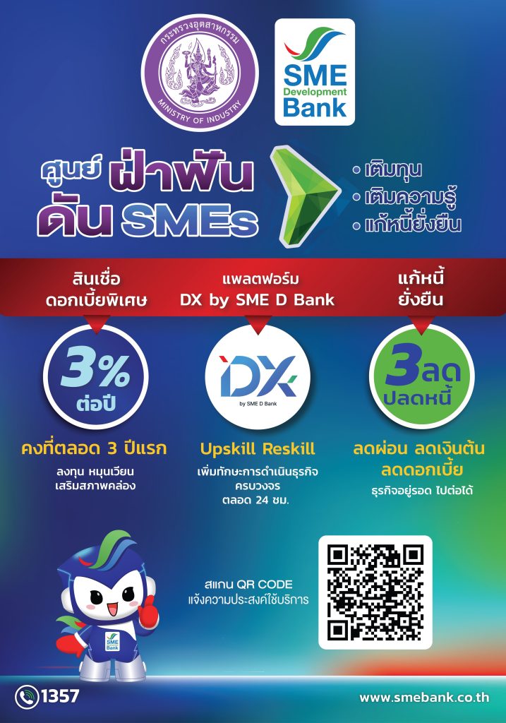 ทั้งนี้ผู้ประกอบการเอสเอ็มอีสามารถติดต่อใช้บริการ “ศูนย์ฝ่าฟัน ดัน SMEs” ได้ ณ สาขา SME D Bank ทั่วประเทศ หรือสแกน QR Code ในโปสเตอร์ประชาสัมพันธ์ รวมถึง ช่องทางออนไลน์ต่างๆ ของธนาคาร เช่น เว็บไซต์ www.smebank.co.th และ LINE Official Account : SME Development Bank เป็นต้น สอบถามข้อมูลเพิ่มเติม Call Center 1357