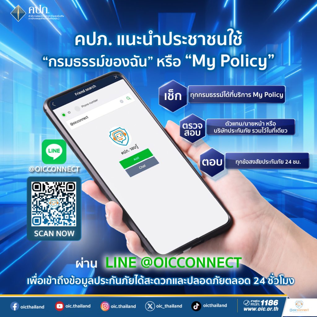 สำนักงานคณะกรรมการกำกับและส่งเสริมการประกอบธุรกิจประกันภัย (สำนักงาน คปภ.) แนะนำให้ประชาชนและ ผู้เอาประกันภัยใช้บริการ OICConnect – “คปภ. รอบรู้” บน LINE Official Account ซึ่งเป็นช่องทางดิจิทัลสำหรับเข้าถึงข้อมูลและบริการด้านประกันภัยได้อย่างสะดวก รวดเร็ว และปลอดภัยตลอด 24 ชั่วโมง โดยเฉพาะในช่วงเวลาที่จำเป็นต้องตรวจสอบความคุ้มครอง สิทธิประโยชน์ หรือข้อมูลกรมธรรม์อย่างทันท่วงที เพื่อยกระดับการให้บริการประชาชนในรูปแบบดิจิทัล ทำให้ผู้เอาประกันภัยสามารถเข้าถึงข้อมูลกรมธรรม์ประกันภัยของตนเองได้ทันที ลดการพึ่งพาเอกสารฉบับจริง และเพิ่มความคล่องตัวในการจัดการข้อมูลด้านประกันภัยได้อย่างมีประสิทธิภาพ