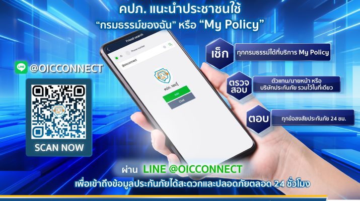 สำนักงาน คปภ. ขอเชิญชวนให้ประชาชนใช้บริการ OICConnect เป็นหนึ่งในช่องทางหลักในการตรวจสอบข้อมูล ด้านประกันภัย เพื่อให้ได้รับข้อมูลที่ถูกต้อง ทันสมัย และสามารถดำเนินการที่เกี่ยวข้องได้อย่างรวดเร็วและมีประสิทธิภาพ พร้อมทั้งยืนยันว่า OICConnect ได้รับการพัฒนาให้มีมาตรฐานความปลอดภัยด้านข้อมูลตามหลักเกณฑ์ที่เหมาะสม และรองรับการใช้งานได้ตลอดเวลา โดยเฉพาะฟีเจอร์ “กรมธรรม์ของฉัน” (My Policy) ที่ช่วยให้ผู้เอาประกันภัยสามารถติดตามข้อมูลกรมธรรม์ของตน จากทุกบริษัทประกันภัยได้ในที่เดียวอย่างสะดวกและครบถ้วน หากมีข้อสงสัยเพิ่มเติม สามารถติดต่อสายด่วน คปภ. 1186 ได้ เพื่อขอข้อมูลและคำแนะนำด้านการประกันภัยได้ ตลอด 24