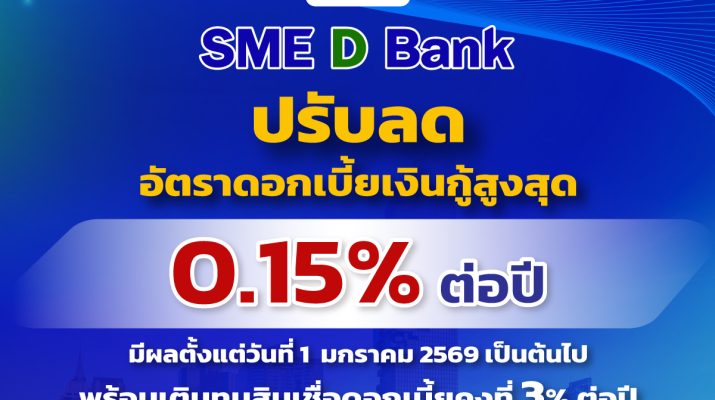 นายพิชิต มิทราวงศ์ กรรมการผู้จัดการ ธนาคารพัฒนาวิสาหกิจขนาดกลางและขนาดย่อมแห่งประเทศไทย (ธพว.) หรือ SME D Bank กล่าวว่า จากที่ประชุมคณะกรรมการนโยบายการเงิน (กนง.) เมื่อวันที่ 17 ธันวาคม 2568 มีมติลดอัตราดอกเบี้ยนโยบาย 0.25% ต่อปี ดังนั้น SME D Bank ธนาคารเพื่อเอสเอ็มอีไทย ขานรับนโยบายธนาคารแห่งประเทศไทย (ธปท.) ประกาศปรับลดอัตราดอกเบี้ยเงินกู้สูงสุด 0.15% เพื่อบรรเทาภาระต้นทุนทางการเงินให้แก่ผู้ประกอบการเอสเอ็มอี และช่วยกระตุ้นเศรษฐกิจ ได้แก่ ลูกค้ารายย่อยชั้นดี (Minimum Retail Rate : MRR) จาก 7.325% ต่อปี ลดลงเหลือ 7.175% ต่อปี และประเภทเงินเบิกเกินบัญชี (Minimum Overdraft Rate : MOR) จาก 7.20% ต่อปี ลดลงเหลือ 7.15% ต่อปี มีผลตั้งแต่วันที่ 1 มกราคม 2569 เป็นต้นไป