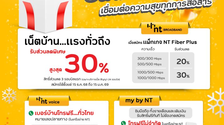 · NT Broadband เน็ตบ้าน…แรงทั่วถึง รับส่วนลดพิเศษสูงสุด 30% เมื่อสมัครแพ็กเกจ NT Fiber Plus