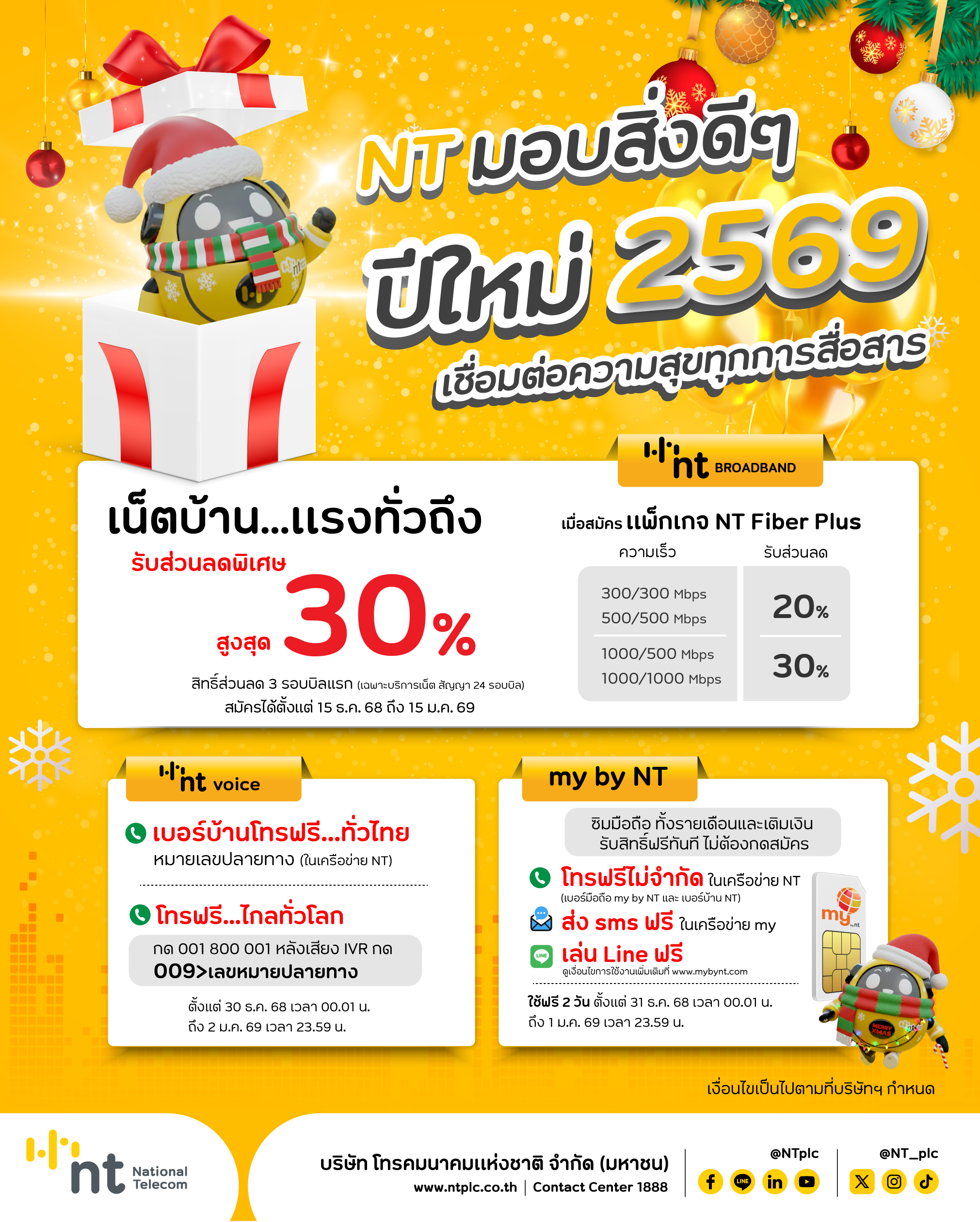 บริษัท โทรคมนาคมแห่งชาติ จำกัด (มหาชน) หรือ NT เปิดแคมเปญพิเศษต้อนรับปีใหม่และฉลองครบรอบ5 ปี ภายใต้แนวคิด “เชื่อมต่อความสุขทุกการสื่อสาร” มอบโปรโมชั่นพิเศษผ่าน 3 บริการหลัก ทั้งเน็ตบ้าน เบอร์บ้าน และมือถือ my by NT เพื่อให้ประชาชนสามารถส่งต่อความสุขและความห่วงใยถึงกันได้อย่างไร้รอยต่อในช่วงเทศกาลปีใหม่ 2569