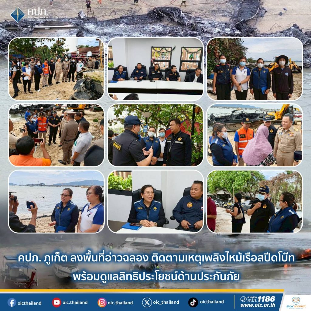 จากกรณีเกิดเหตุเพลิงไหม้เรือสปีดโบ๊ทของผู้ประกอบการธุรกิจท่องเที่ยว จำนวน 24 ลำ บริเวณท่าเทียบเรืออ่าวฉลอง ตำบลฉลอง อำเภอเมือง จังหวัดภูเก็ต เหตุเกิดเมื่อวันที่ 7 มกราคม 2569 โดยไม่มีผู้ได้รับบาดเจ็บหรือเสียชีวิต เพื่อให้การดูแลและคุ้มครองสิทธิประโยชน์ด้านการประกันภัยเป็นไปอย่างถูกต้อง ครบถ้วน รวดเร็ว และเป็นธรรม นายชูฉัตร ประมูลผล เลขาธิการสำนักงานคณะกรรมการกำกับและส่งเสริมการประกอบธุรกิจประกันภัย (เลขาธิการ คปภ.) ได้สั่งการให้นางสาวกาญจนา ศรีรักษา ผู้อำนวยการสำนักงาน คปภ. จังหวัดภูเก็ต ลงพื้นที่อย่างเร่งด่วน เพื่อติดตามสถานการณ์เหตุเพลิงไหม้เรือท่องเที่ยวบริเวณท่าเรืออ่าวฉลอง จังหวัดภูเก็ต พร้อมเร่งติดตามและรวบรวมรายงานความเสียหายผ่าน Platform การรายงานข้อมูลกรณีอุบัติภัยกลุ่มหรือรายใหญ่ด้วยระบบอิเล็กทรอนิกส์ เพื่อใช้ประกอบการพิจารณาให้ความช่วยเหลือด้านการประกันภัยอย่างเป็นระบบ