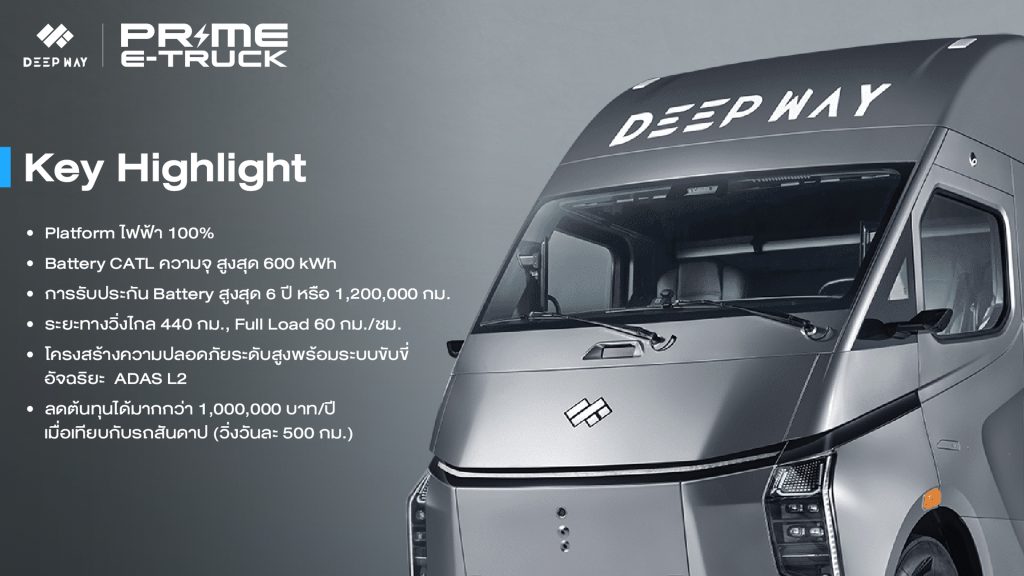 บริษัท ไพร์ม อี ทรัค จำกัด (Prime E Truck) ผู้นำด้านโซลูชันยานยนต์ไฟฟ้าเพื่อการพาณิชย์ในประเทศไทย ประกาศความร่วมมือเชิงกลยุทธ์กับ DeepWay ผู้พัฒนาเทคโนโลยีรถหัวลากไฟฟ้าอัจฉริยะระดับโลก โดยแต่งตั้งให้ Prime E Truck เป็น ผู้จัดจำหน่ายรถหัวลากไฟฟ้า DeepWay อย่างเป็นทางการแต่เพียงผู้เดียวในประเทศไทย เปิดตัวรถหัวลากไฟฟ้า 100% รุ่นเรือธง “DeepWay Star 6×4” อย่างเป็นทางการในตลาดไทย พร้อมลงนามบันทึกความเข้าใจ (MOU) เพื่อร่วมกันผลักดันการเปลี่ยนผ่านโลจิสติกส์ไทยจากระบบดีเซลสู่ระบบพลังงานไฟฟ้าอย่างเป็นระบบ ความร่วมมือครั้งนี้ถือเป็นจุดเปลี่ยนครั้งสำคัญของอุตสาหกรรมขนส่งไทยสู่ยุค “โลจิสติกส์สีเขียว”