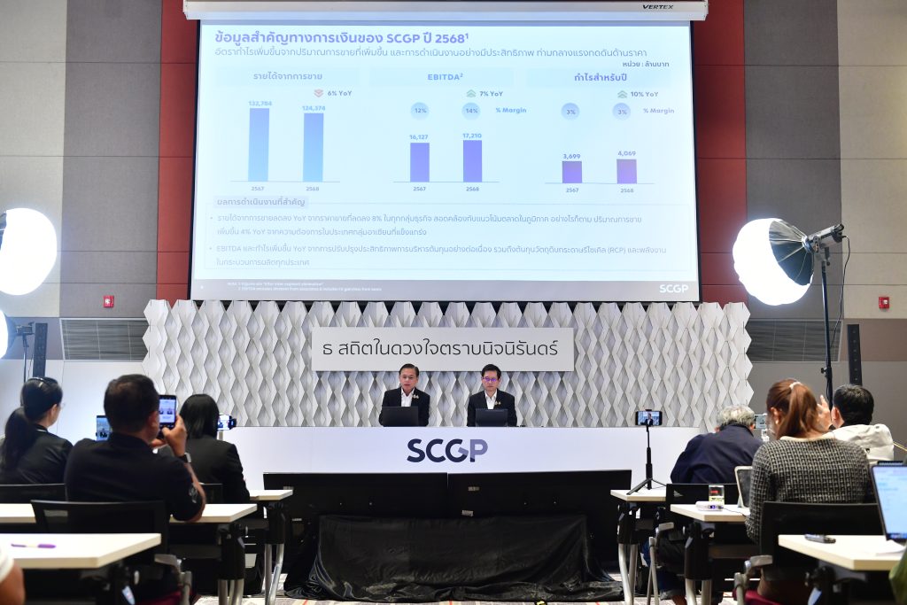 ทั้งนี้โดยSCGP ดำเนินกลยุทธ์การบริหารงานอย่างมีวินัย บริหารต้นทุนอย่างมีประสิทธิภาพ และปรับตัวอย่างรวดเร็วให้สอดรับกับสถานการณ์ที่เปลี่ยนแปลง ส่งผลให้มีปริมาณการขายสินค้าเพิ่มขึ้นและอัตราการใช้กำลังการผลิตที่ดีขึ้น อีกทั้งยังเดินหน้าขยายธุรกิจกลุ่มสินค้าและบรรจุภัณฑ์ที่เชื่อมโยงกับผู้บริโภคอย่างต่อเนื่อง เพื่อเสริมศักยภาพและความแข็งแกร่งแก่ธุรกิจหลักตามแผนกลยุทธ์ โดยปี 2568 สามารถปิดดีลเข้าถือหุ้นร้อยละ 100 ในบริษัท PT Prokemas Adhikari Kreasi (MYPAK) เพิ่มสัดส่วนถือหุ้นจาก ร้อยละ 70 เป็นร้อยละ 100 ใน Duy Tan Plastics Manufacturing Corporation (Duy Tan) และร่วมทุนร้อยละ 25 กับ Howa Sangyo Co., Ltd. (HOWA) จากญี่ปุ่น เพื่อผลิตบรรจุภัณฑ์แบบอ่อนตัวที่ใช้เทคโนโลยีขั้นสูงสำหรับตลาดอาหารสัตว์เลี้ยง และการลงทุนตั้งฐานการผลิตกระบอกฉีดยา 180 ล้านชิ้นต่อปี ในโรงงานของบริษัทวีอีเอ็ม (ไทยแลนด์) จำกัด นอกจากนี้ ยังได้รับผลดีจากต้นทุนวัตถุดิบกระดาษรีไซเคิลและราคาพลังงานที่ลดลง อย่างไรก็ตาม เนื่องจากราคาขายบรรจุภัณฑ์ปรับลดลง ส่งผลให้ปี 2568 มีรายได้จากการขาย 124,374 ล้านบาท ลดลงร้อยละ 6 เมื่อเทียบกับปีก่อน ขณะที่ EBITDA 17,210 ล้านบาท เพิ่มขึ้นร้อยละ 7 เมื่อเทียบกับปีก่อน และกำไรสำหรับปี 4,069 ล้านบาท เพิ่มขึ้นร้อยละ 10 เมื่อเทียบกับปีก่อน