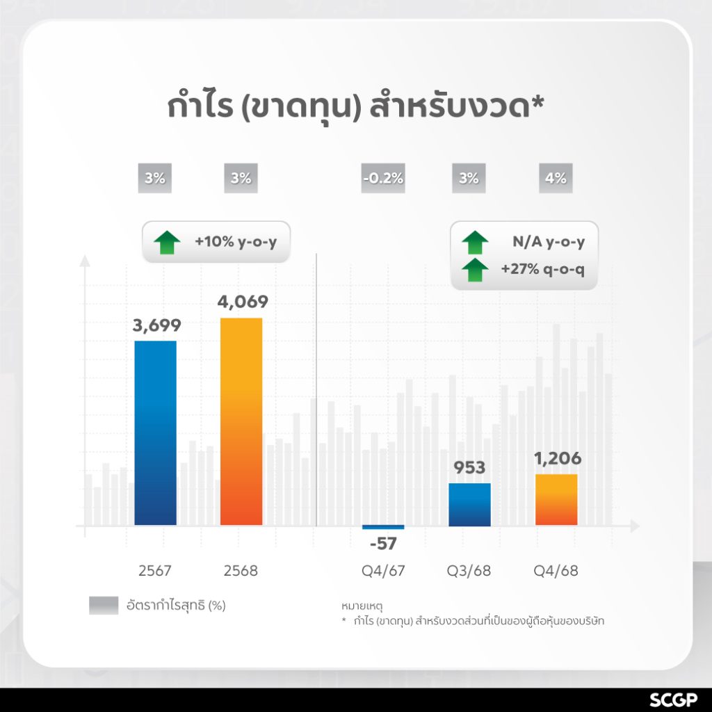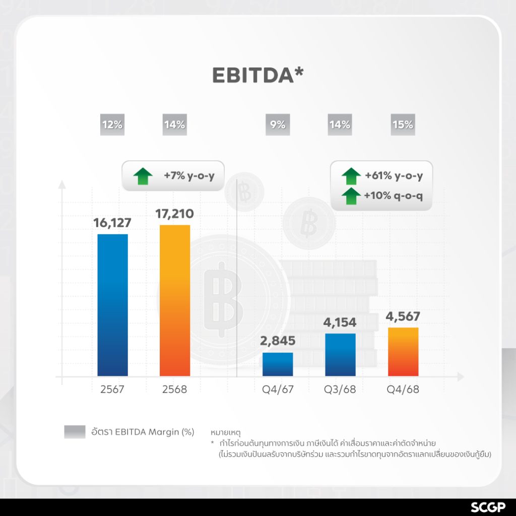สำหรับผลการดำเนินงานไตรมาส 4 ปี 2568 มีรายได้จากการขาย 30,170 ล้านบาท ลดลงร้อยละ 3 เมื่อเทียบกับช่วงเดียวกันของปีก่อน มี EBITDA 4,567 ล้านบาท เพิ่มขึ้นร้อยละ 61 เมื่อเทียบกับช่วงเดียวกันของปีก่อน และกำไรสำหรับงวด 1,206 ล้านบาท เพิ่มขึ้นเมื่อเทียบกับช่วงเดียวกันของปีก่อน เนื่องจากมีกำไรส่วนเพิ่มจากการซื้อกิจการ MYPAK สะท้อนการลงทุนที่มีประสิทธิภาพ