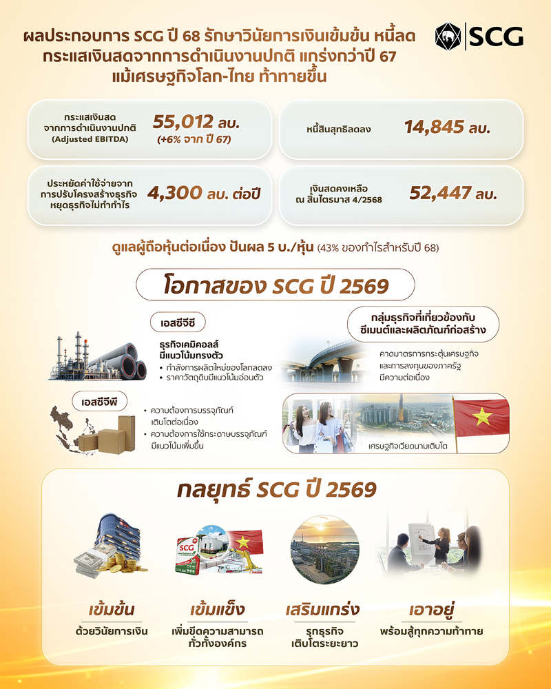 ผลประกอบการเอสซีจีปี 68 รักษาวินัยการเงินเข้มข้น กระแสเงินสดจากการดำเนินงานปกติ ที่ไม่รวมรายการพิเศษ (Adjusted EBITDA) 55,012 ล้านบาท แข็งแกร่งกว่าปี 67 คิดเป็น 6% ขณะที่หนี้ลดลง 14,845 ล้านบาทจากปีก่อน แม้เศรษฐกิจโลกและไทยท้าทายขึ้น ชี้ผลการปรับโครงสร้างธุรกิจ หยุดธุรกิจไม่ทำกำไร และประหยัดค่าใช้จ่าย ได้รวมกว่า 4,300 ล้านบาทต่อปี พร้อมเคาะปันผล 5.0 บาท/หุ้น ดูแลผู้ถือหุ้นต่อเนื่อง ปี 2569 ธุรกิจเคมิคอลส์มีแนวโน้มทรงตัว เนื่องจากกำลังการผลิตใหม่ของโลกลดลง และราคาวัตถุดิบมีแนวโน้มอ่อนตัว เอสซีจีจึงเดินหน้าเข้มข้น ด้วยวินัยการเงิน – เข้มแข็ง เพิ่มขีดความสามารถทั่วองค์กร – เสริมแกร่ง รุกธุรกิจเติบโตระยะยาว มุ่งกลยุทธ์ Regional Optimization ชูเวียดนาม เป็นฐานผลิตรับตลาดในประเทศและส่งออกตลาดโลก พร้อมดันสินค้า SVP – HVA และ Green ที่แนวโน้มเติบโตสูง – เอาอยู่ พร้อมสู้ทุกความท้าทาย