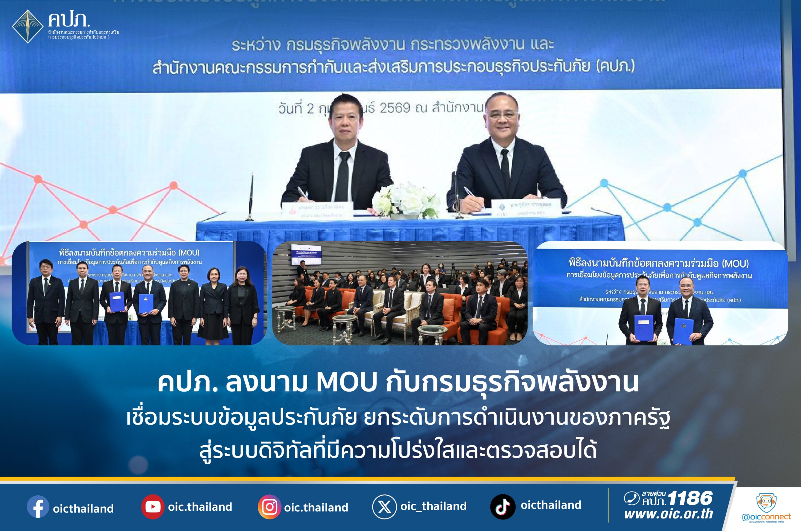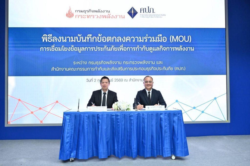 เมื่อวันที่ 2 กุมภาพันธ์ 2569 สำนักงานคณะกรรมการกำกับและส่งเสริมการประกอบธุรกิจประกันภัย (สำนักงาน คปภ.) จัดพิธี ลงนามบันทึกข้อตกลงความร่วมมือว่าด้วยการเชื่อมโยงข้อมูลการประกันภัยตามกฎหมายว่าด้วยการควบคุมน้ำมันเชื้อเพลิง เพื่อใช้ประโยชน์ ในการพิจารณาออกใบอนุญาตและกำกับดูแลการประกอบกิจการควบคุมประเภทที่ 3 ระหว่างกรมธุรกิจพลังงาน กระทรวงพลังงาน กับสำนักงาน คปภ. โดยมี นายชูฉัตร ประมูลผล เลขาธิการ คปภ. และ นายสราวุธ แก้วตาทิพย์ อธิบดีกรมธุรกิจพลังงาน เป็นผู้ลงนาม ณ ห้องประชุมสถาบันวิทยาการประกันภัย ชั้น 2 สำนักงาน คปภ.