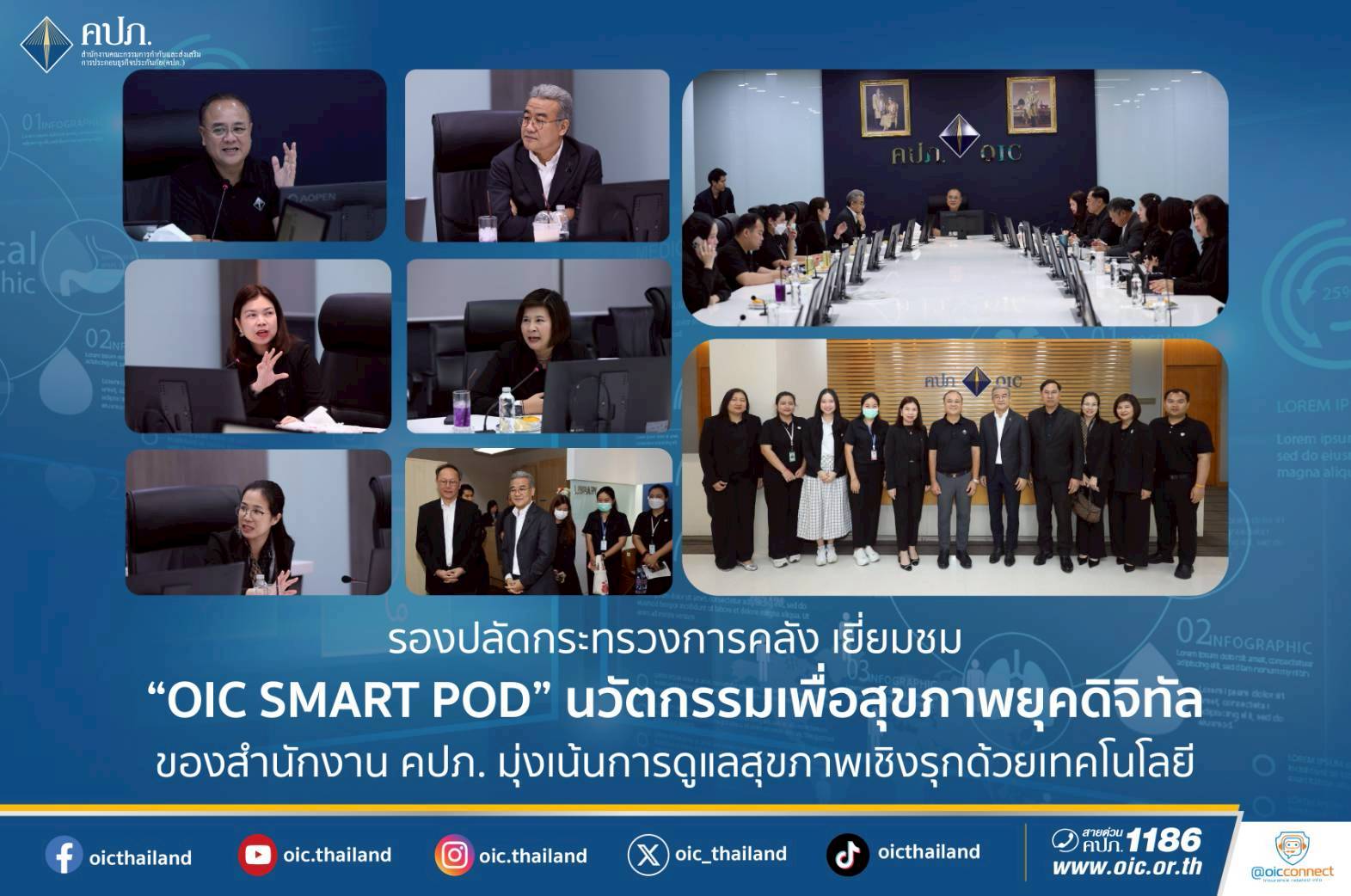 เมื่อวันที่ 30 มกราคม 2569 นายอรรถพล อรรถวรเดช รองปลัดกระทรวงการคลัง พร้อมคณะ เดินทางเข้าเยี่ยมชม การดำเนินงานของสำนักงานคณะกรรมการกำกับและส่งเสริมการประกอบธุรกิจประกันภัย (สำนักงาน คปภ.) โดยติดตาม ความคืบหน้า โครงการนวัตกรรมเพื่อสุขภาพ “OIC SMART POD” ซึ่งเป็นหนึ่งในโครงการสำคัญที่มุ่งยกระดับคุณภาพชีวิตและสุขภาวะของบุคลากรสำนักงาน คปภ. ผ่านการนำเทคโนโลยีมาประยุกต์ใช้