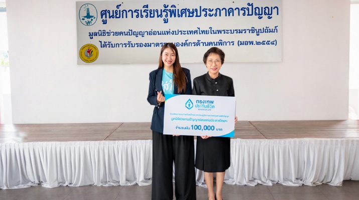 บริษัท กรุงเทพประกันชีวิต จำกัด (มหาชน) เดินหน้าสานต่อภารกิจด้านความรับผิดชอบต่อสังคม (CSR) ด้วยการส่งต่อ “พลังของความใส่ใจ” ในเดือนแห่งความรัก โดยมุ่งยกระดับคุณภาพชีวิต ของกลุ่มเปราะบางในสังคม ผ่านการสนับสนุนด้านการศึกษาและการพัฒนาศักยภาพอย่างยั่งยืน โดย นางสาวศริฐณี ศิริสมบูรณ์ ผู้จัดการอาวุโส ส่วนงานประชาสัมพันธ์และกิจกรรมเพื่อสังคม (ซ้าย) เป็นผู้แทนบริษัทฯ มอบเงินสนับสนุนจำนวน 100,000 บาท ให้แก่ “ศูนย์การเรียนรู้พิเศษประภาคารปัญญา” ในสังกัดมูลนิธิช่วยคนปัญญาอ่อนแห่งประเทศไทย ในพระบรมราชินูปถัมภ์ เพื่อส่งเสริมโอกาสในการเรียนรู้และพัฒนาคุณภาพชีวิตของผู้มีความบกพร่องทางสติปัญญา โดยมี นางกาญจนา ภัทราพรนันท์ ผู้อำนวยการศูนย์การเรียนรู้พิเศษประภาคารปัญญา (ขวา) เป็นผู้รับมอบ ณ ศูนย์การเรียนรู้พิเศษประภาคารปัญญา แขวงฉิมพลี เขตตลิ่งชัน กรุงเทพฯ