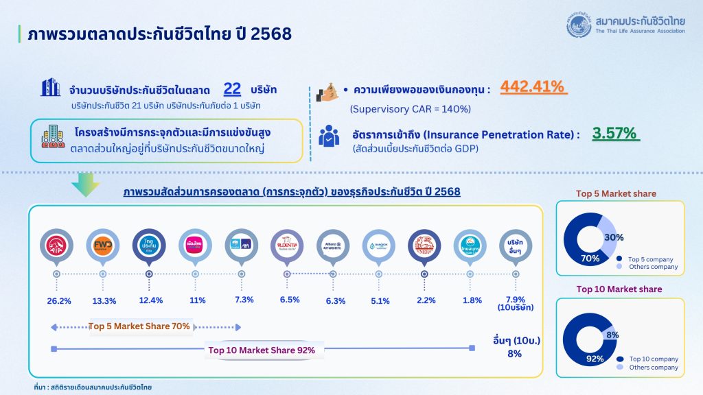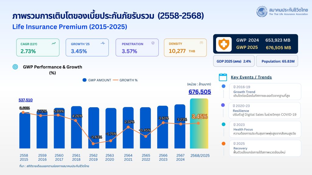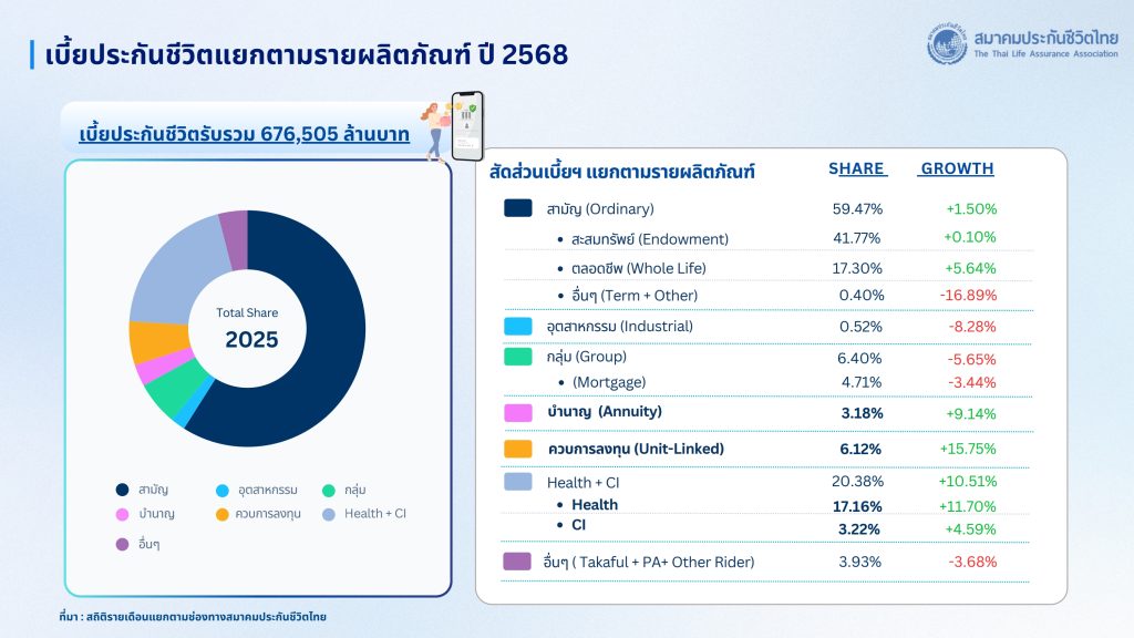 นางนุสรา (อัสสกุล) บัญญัติปิยพจน์ นายกสมาคมประกันชีวิตไทย เปิดเผยว่า เผยภาพรวมธุรกิจประกันชีวิตของปี 2568 ระหว่าง มกราคม – ธันวาคม มีเบี้ยประกันภัยรับรวม (Total Premium) อยู่ที่ 676,505 ล้านบาท เติบโตเพิ่มขึ้นร้อยละ 3.45 เมื่อเทียบกับปี 2567 จำแนกเป็น เบี้ยประกันภัยรับรายใหม่ (New Business Premium) 190,886 ล้านบาท อัตราการเติบโตเพิ่มขึ้นร้อยละ 3.60 และเบี้ยประกันภัยรับปีต่อไป (Renewal Premium) 485,619 ล้านบาทมีอัตราการเติบโตเพิ่มขึ้นร้อยละ 3.40 คิดเป็นอัตราความคงอยู่ของกรมธรรม์ร้อยละ 82