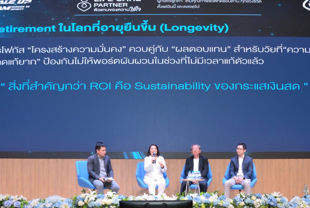 คุณนรินทร์ เอกวงศ์วิริยะ ผู้อำนวยการอาวุโส ฝ่ายการตลาดและสื่อสารองค์กร กรุงเทพประกันชีวิต กล่าวว่า Pre -Retirement ในโลกที่อายุยืนขึ้น (Longevity) ควรเน้นการโฟกัส “โครงสร้างความมั่นคง” ควบคู่กับ “ผลตอบแทน” สำหรับวัยที่ “ความผิดพลาดแก้ยาก” การป้องกันไม่ให้พอร์ตผันผวนในช่วงที่ไม่มีเวลาแก้ตัวแล้ว สิ่งที่สำคัญกว่า ROI คือ Sustainability ของกระแสเงินสด แผนการเงินที่คนมีอายุยืนขึ้น จึงควรปรับเป้าหมายไม่ใช่เพียงให้ “พอใช้” เท่านั้นแต่ควรเพื่อ “คุณภาพชีวิตระยะยาว”